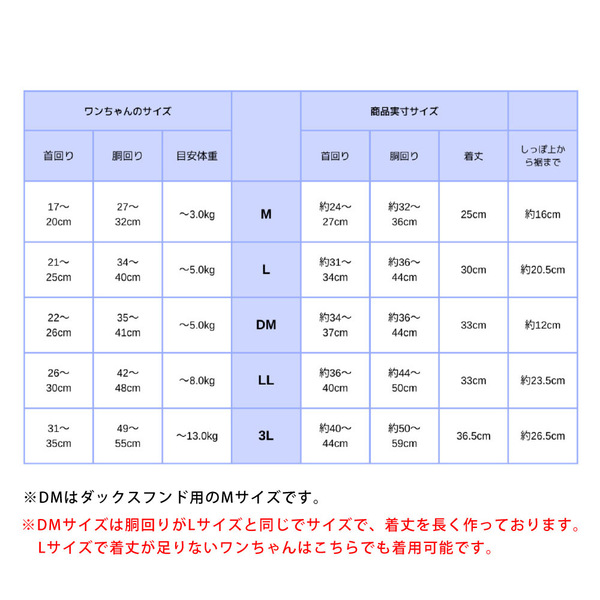 ※DMサイズは胴回りがLサイズと同じでサイズで、着丈を長く作っております。
