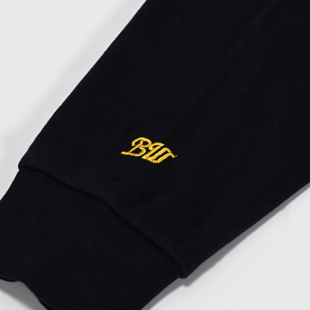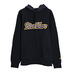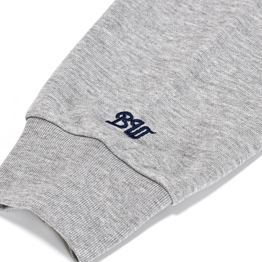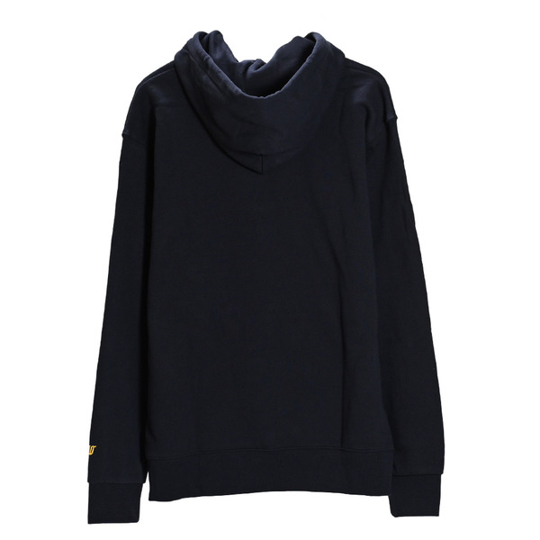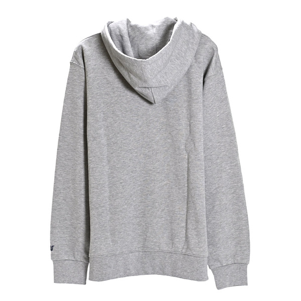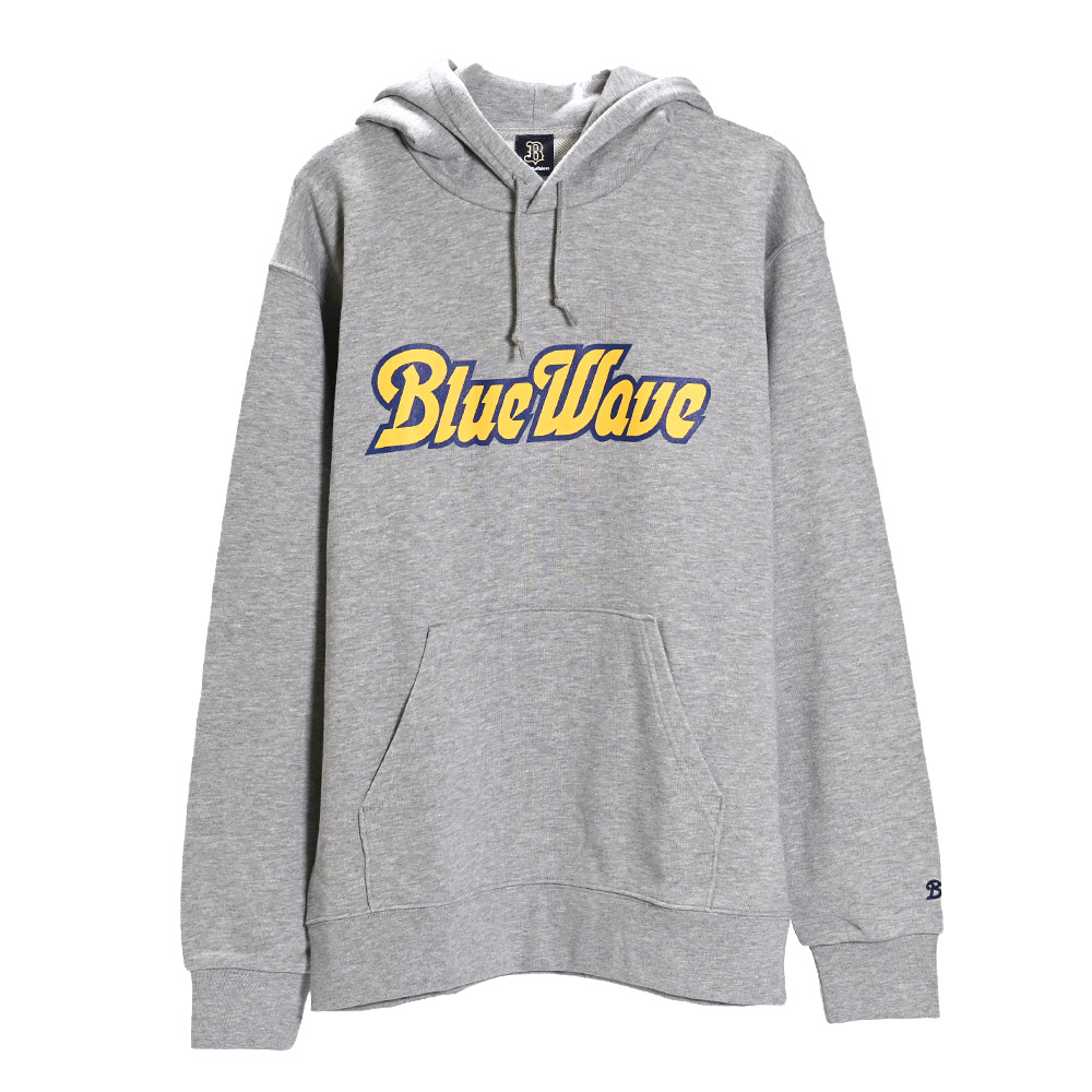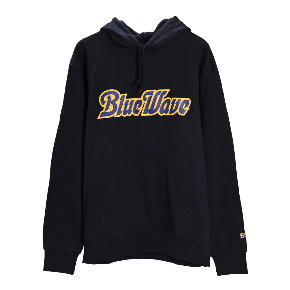 胸にはプリント、左袖には刺繍でロゴをマークした、シンプルなブルーウェーブデザインのパーカー。