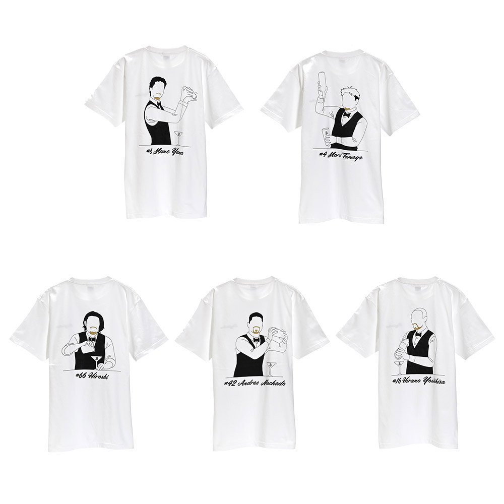 「髭が似合うバーテンダー」をテーマとした「オリ髭投票2025」にて見事トップ5にランクインしたオリ髭選手たちのTシャツ。