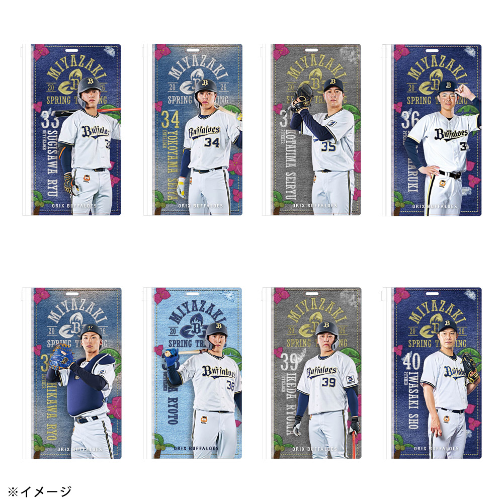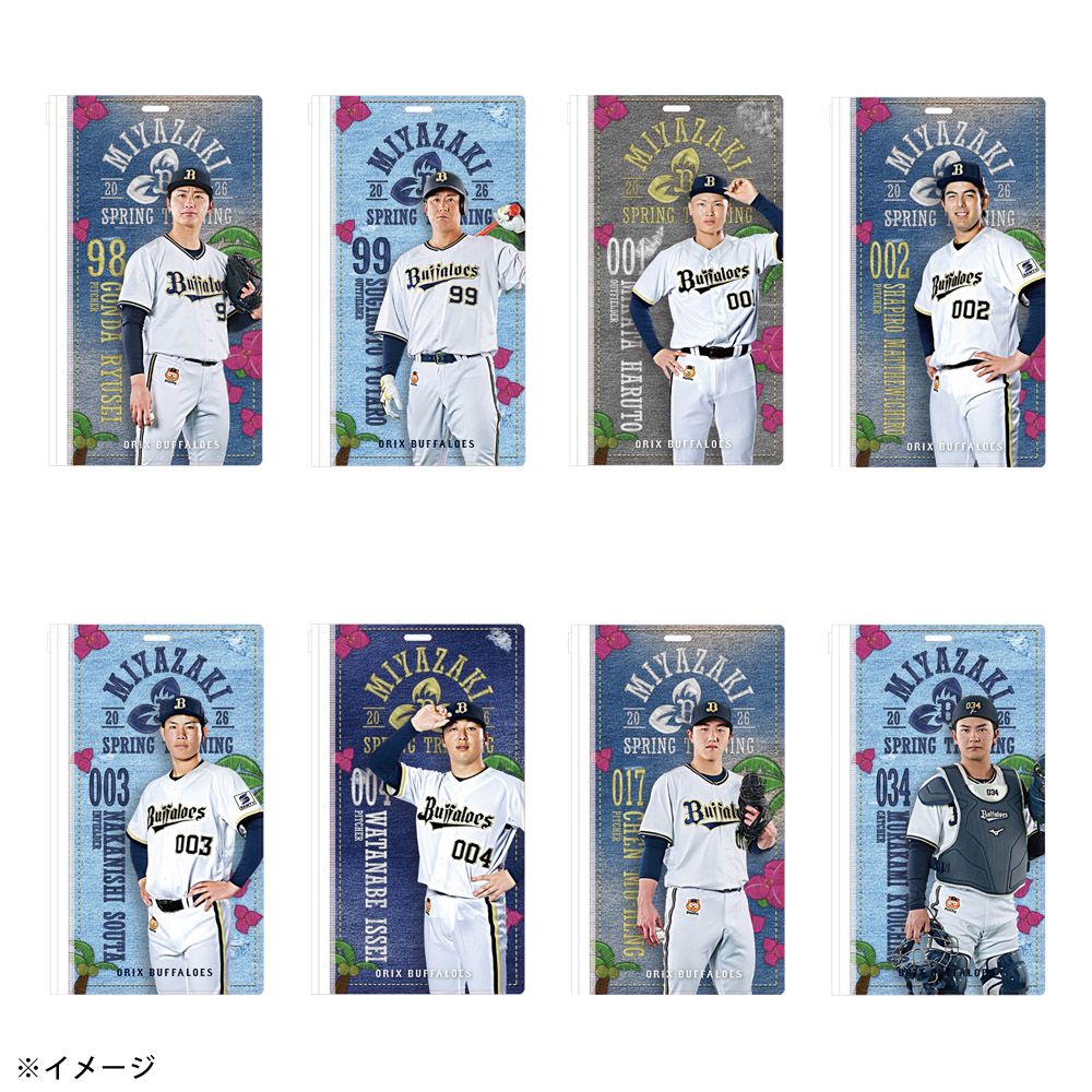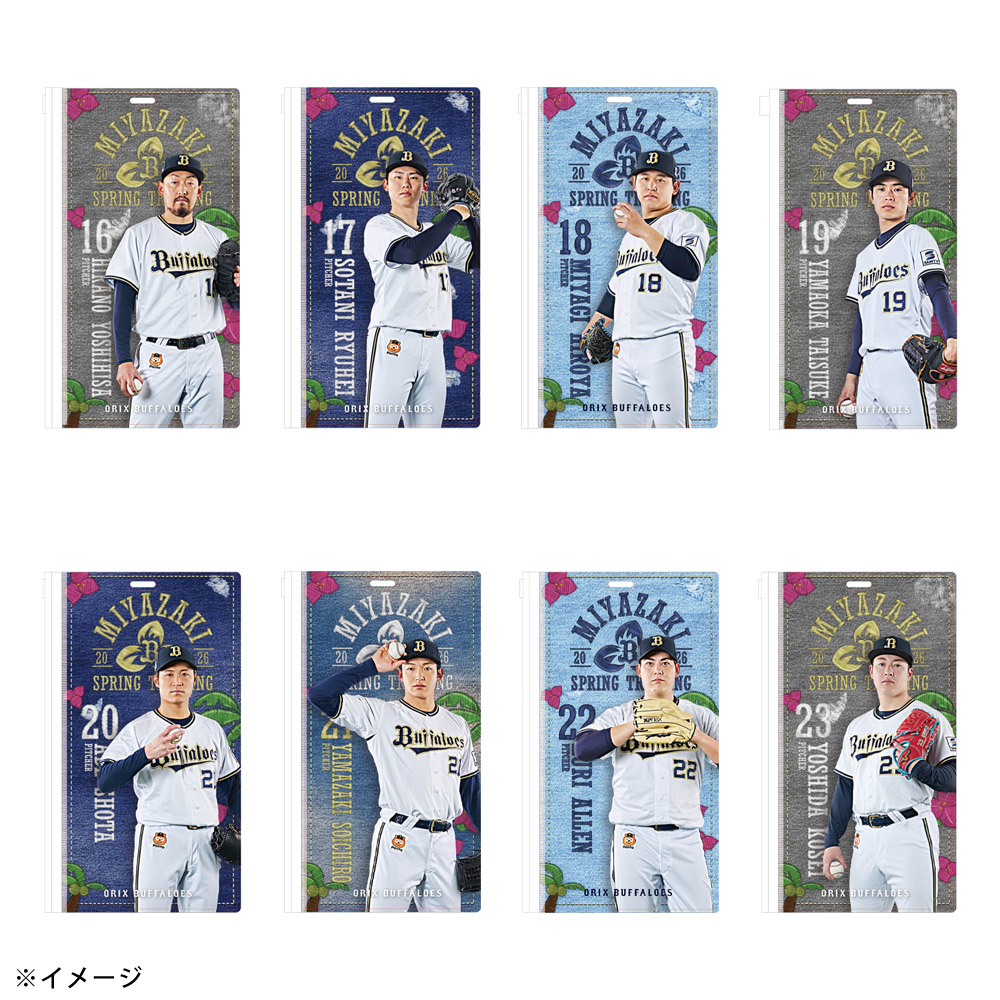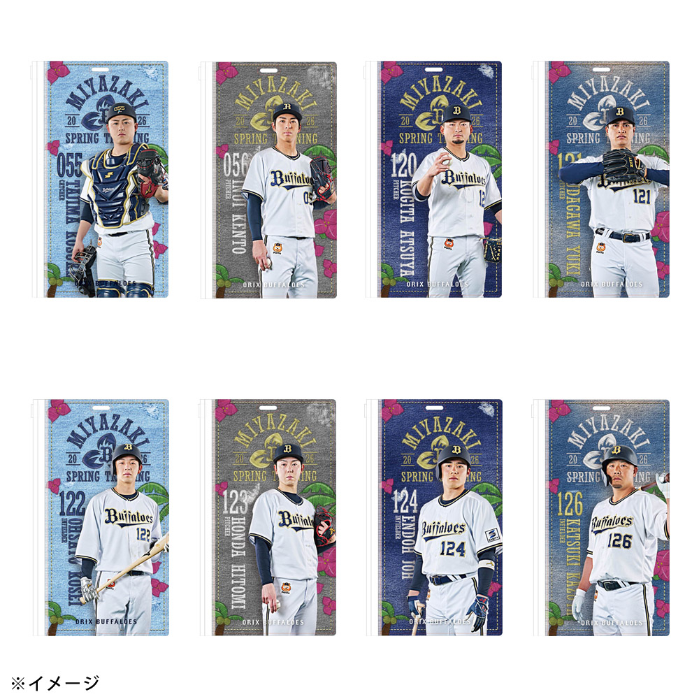 春季キャンプ地のバファローズタウンに並ぶ岸田監督や選手の”のぼりデザイン”を使用したチケットホルダーです。