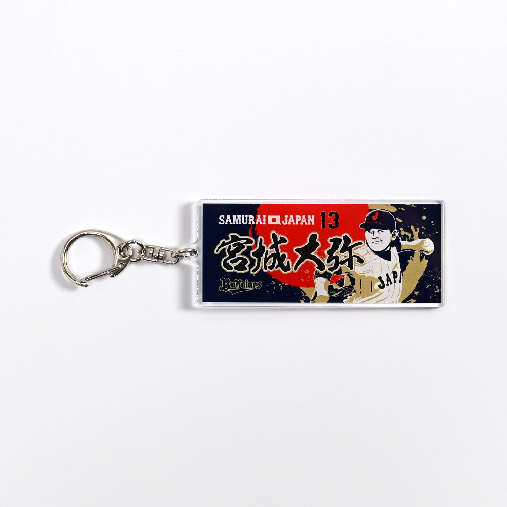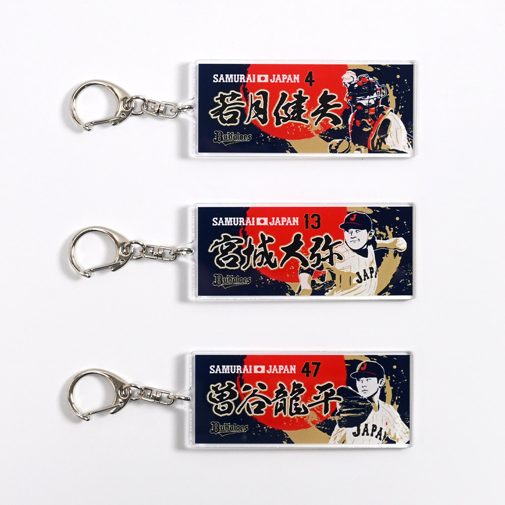 バファローズから野球日本代表「侍ジャパン」に選出された若月健矢選手、宮城大弥投手、曽谷龍平投手のアクリルキーホルダーです。