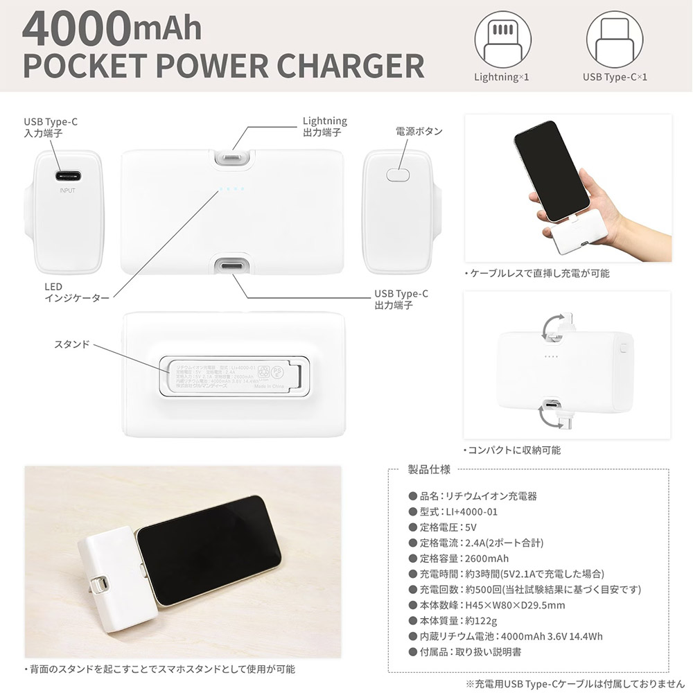 Buffaloes Lightning/Type-Cコネクタ付き リチウムイオン充電器(4000mAh)
