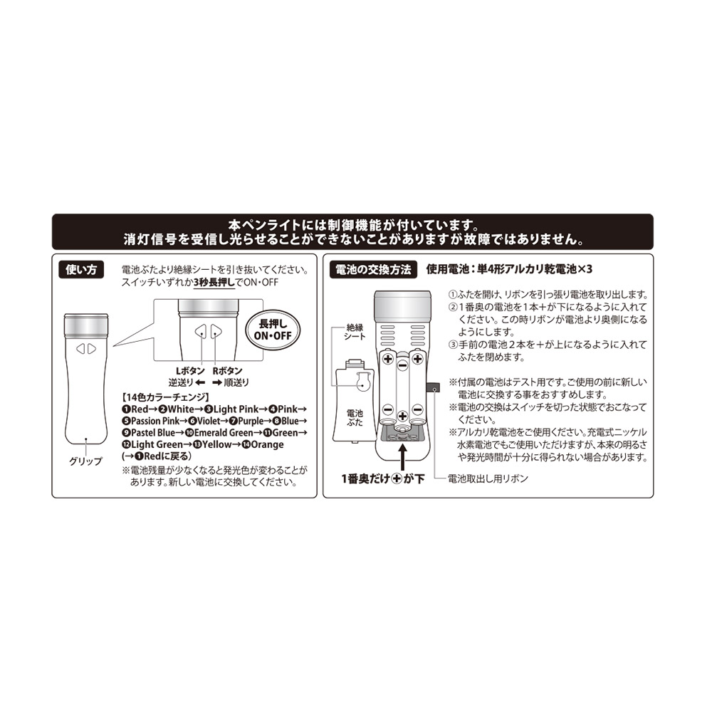 - ※ペンライトには制御機能が付いており、運営側の演出上の操作により点灯・消灯が行われます。制御中はご自身で操作することができませんが、故障ではありません。