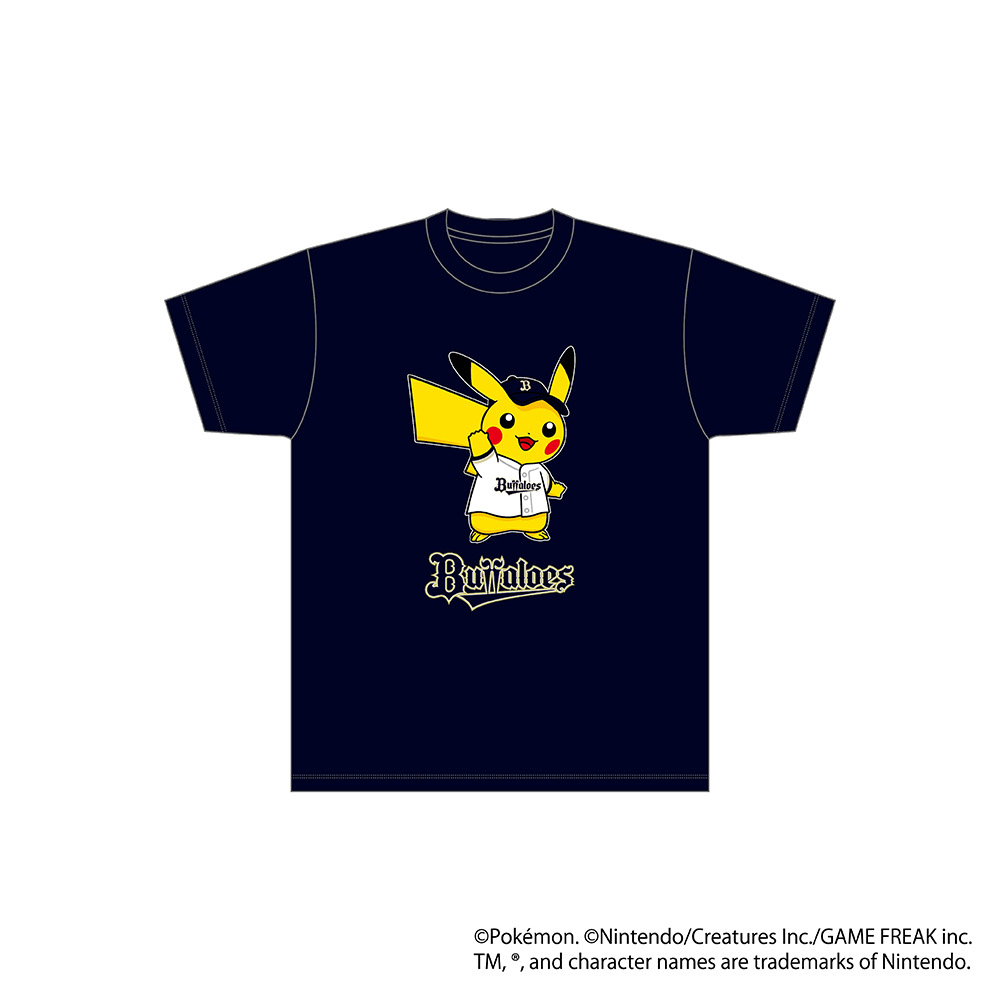 バファローズのキャップ&ユニフォームを着用したピカチュウのプリントがインパクト抜群のTシャツです。