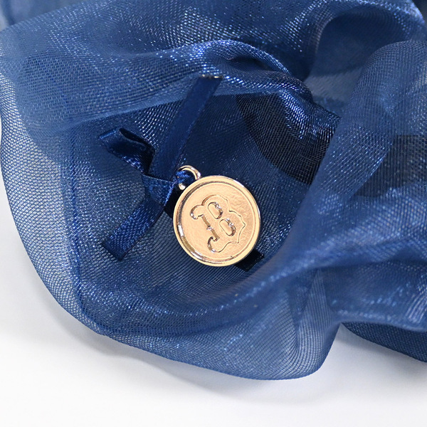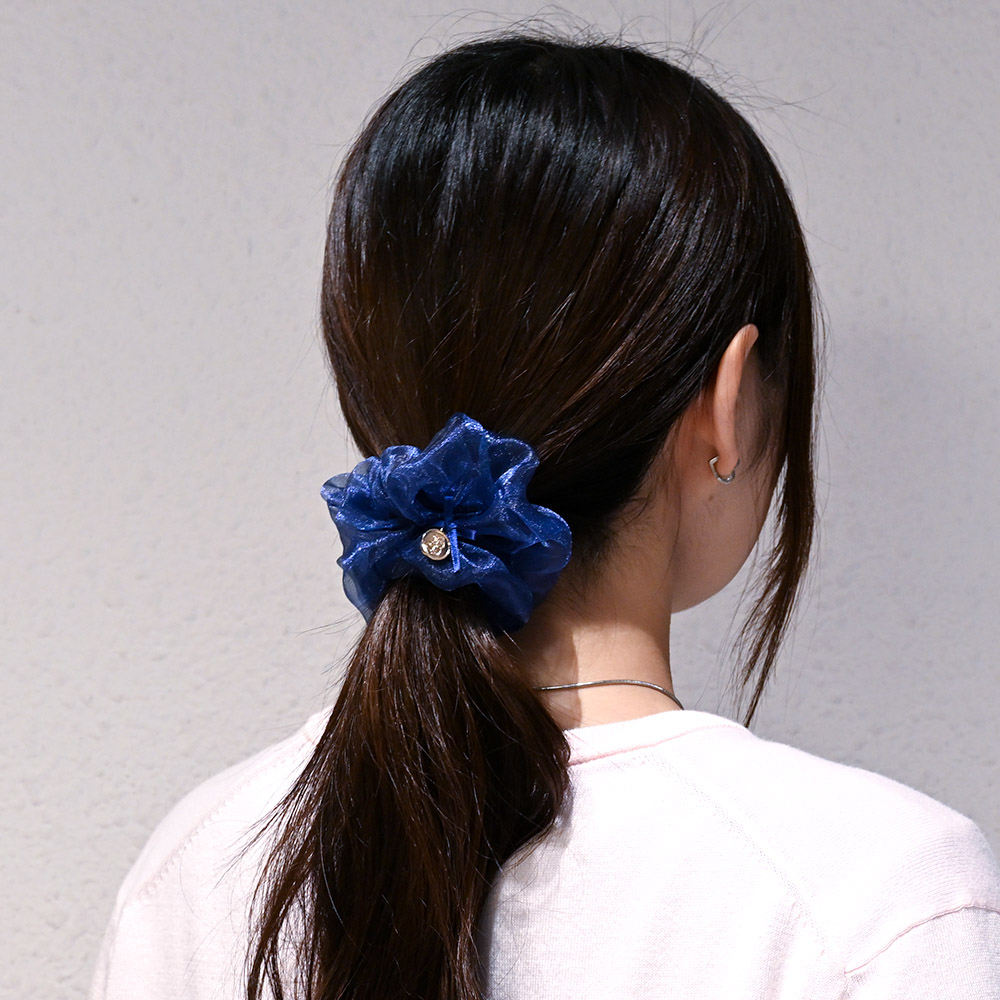 シアー生地にリボンをあしらい、シンプルなチャームが付いたシュシュ。